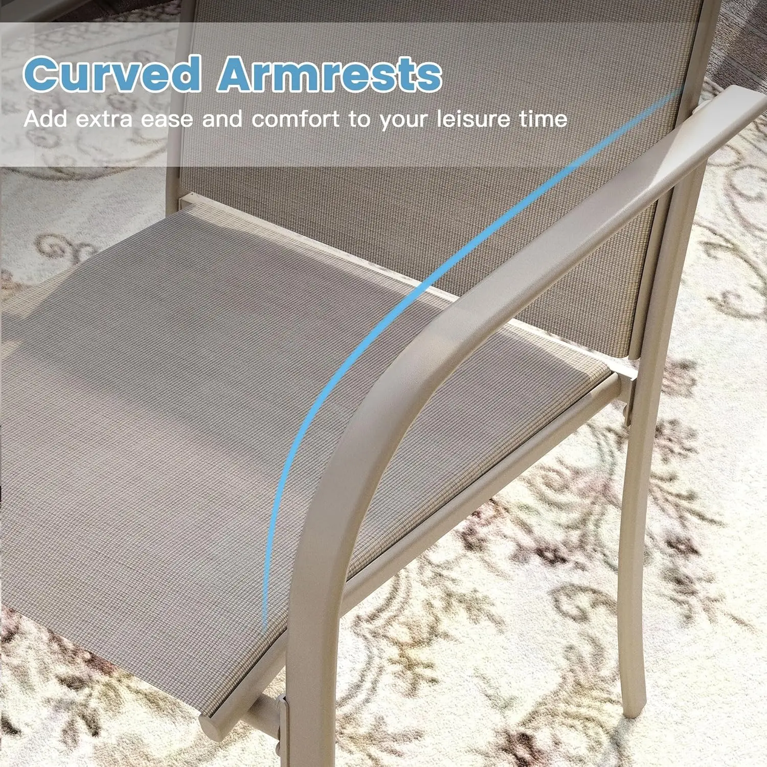 【Stackable Chairs】The lightweight metal chairs can be stacked up to 8 high when not in use for easy storage and space saving. The fabric is made of premium textilene, which is durable, non-fading, waterproof, breathable, suitable for all weather